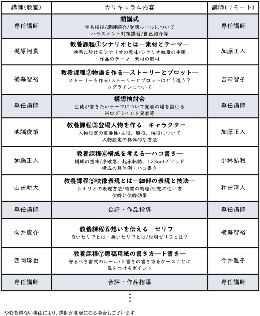 このたびシナリオ講座では、シナリオ執筆の基礎をより深く、体系的に学べるよう、従来の基礎科教養課程のカリキュラムを見直し、より理解しやすく、取り組みやすい内容に改訂いたしました。
